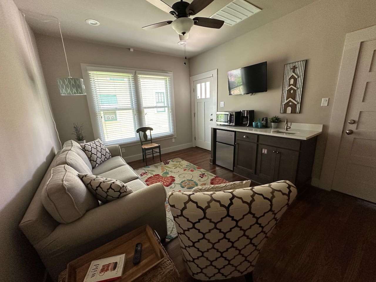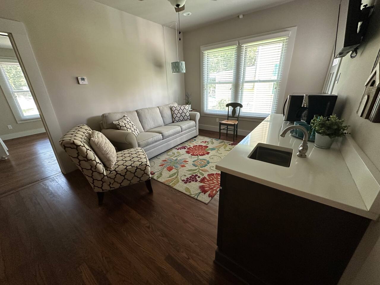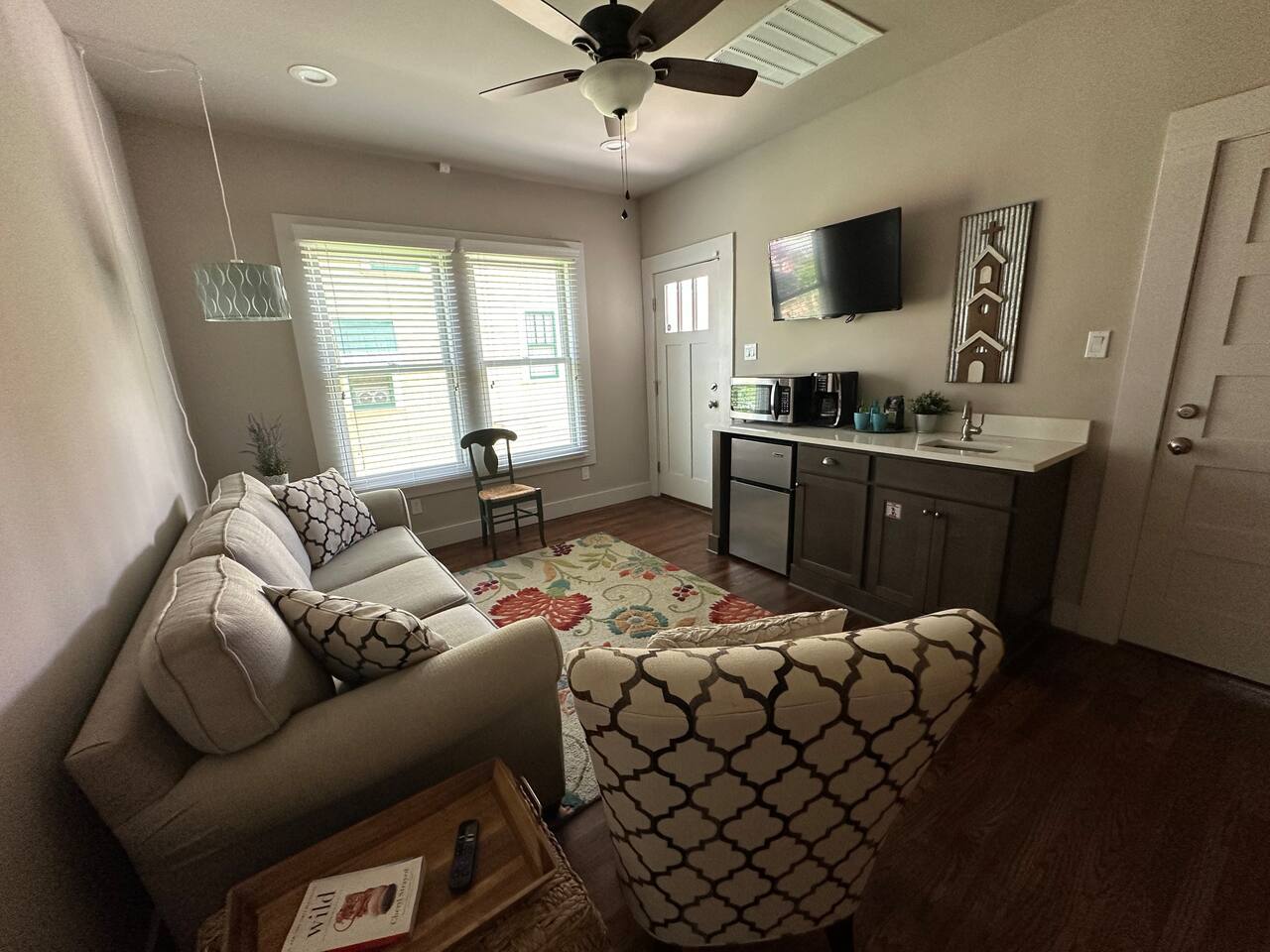 Spacious suite with a large bedroom, private bathroom, and den featuring a wet bar, mini fridge, microwave, coffee maker, and sink. Ideal for business travelers, with high-speed internet and driveway parking. Available exclusively for up to 2 guests, with the remainder of the home not accessible during the stay or open to other bookings. Guests have access to the backyard and porch. Near Downtown and close to I-10 for easy access. Private entry accessed by lockbox.