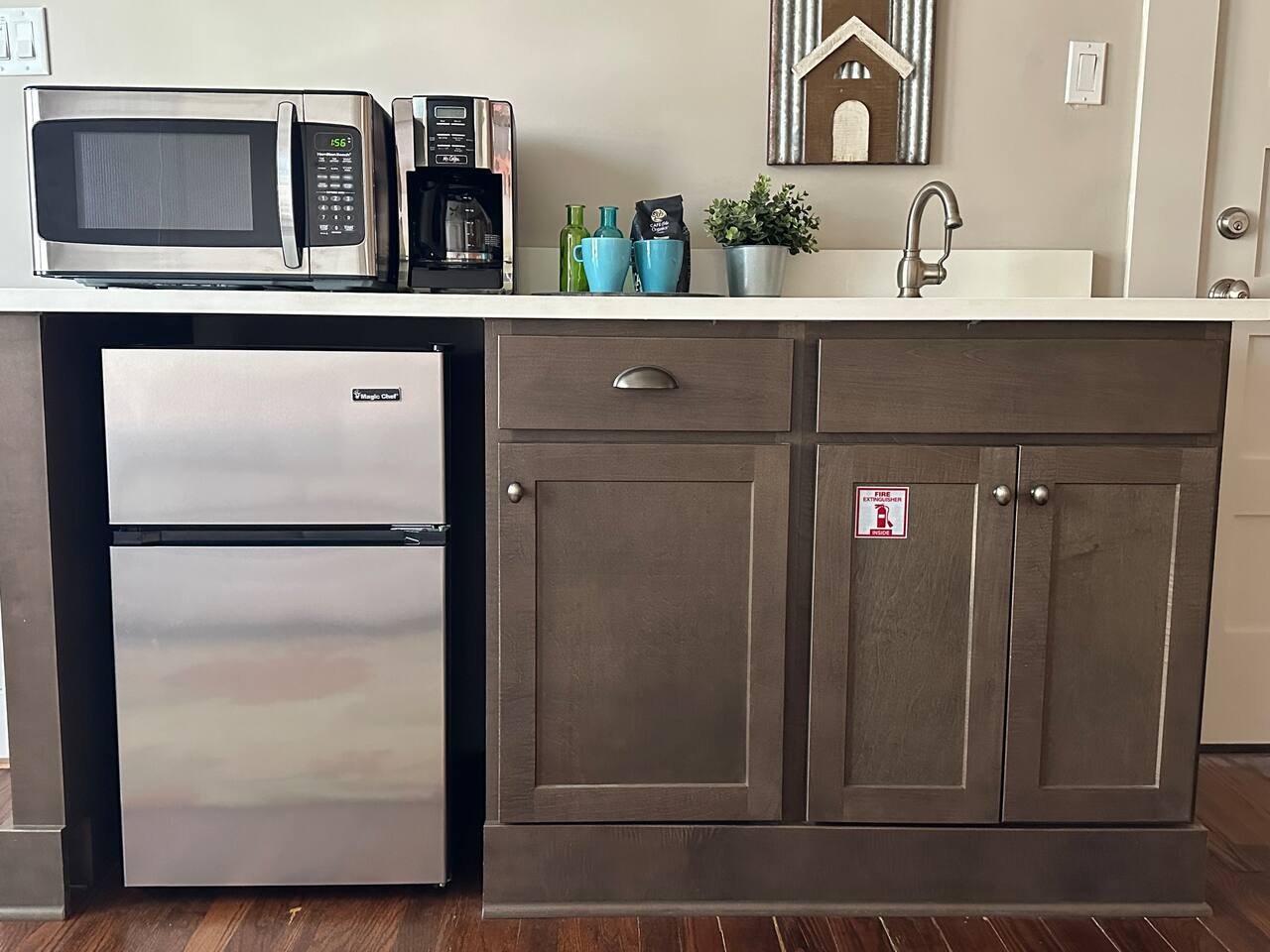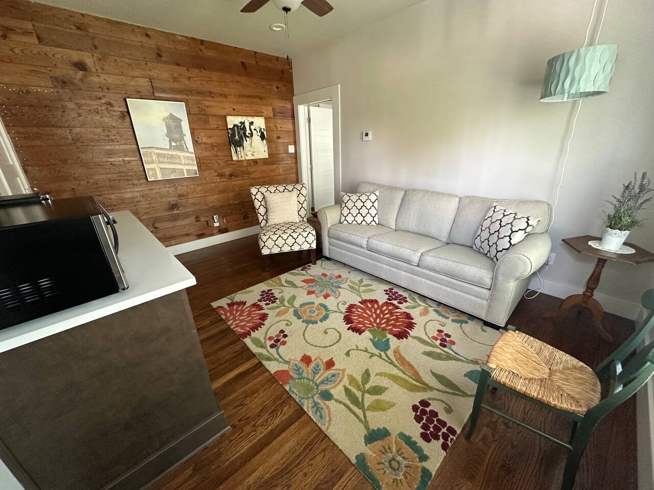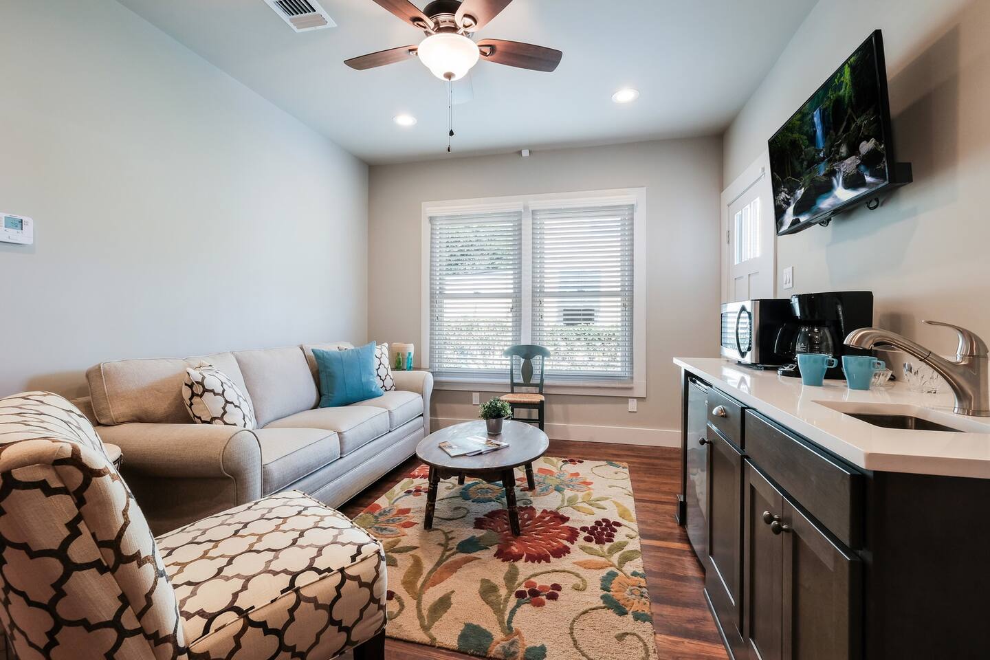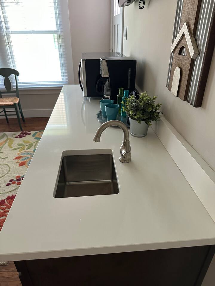 Please note: this is similar to a large 1-bedroom suite you may find at a hotel. There is no kitchen. However, the wetbar has its own sink with a microwave, coffee-pot, & mini fridge for your use. There are coffee mugs, wine glasses, a wine opener, and some utensils as well. If there is something you may need before your arrival, I will do my best to accommodate a reasonable request.