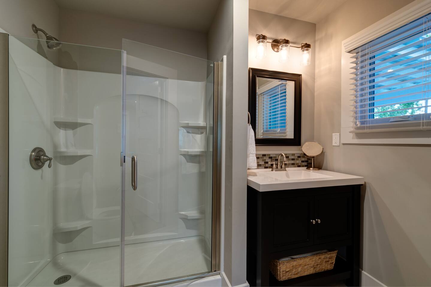 This is a spacious suite with a large bedroom that includes a king-sized bed extra table & chair, a closet and a private bathroom which includes a 3 X 6 shower with towels and linens, blow dryer, shampoo, conditioner, body wash, etc. The Den features a wet bar, mini fridge, microwave, coffee maker (Coffee, mini moos, and sugar included), and includes a large sofa and chair for the seating space. Both the bedroom and den include Roku TVs connected to our high-speed internet. There is driveway parking up to the entry door. Guests will have access to the backyard patio/deck and the front porch.